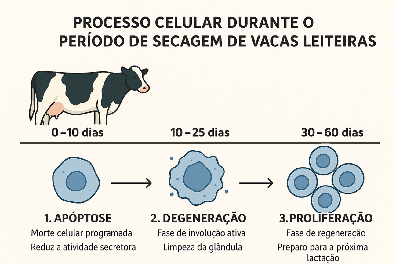 Fisiologicamente, após a secagem, a glândula mamária passa inicialmente por um processo de involução (nas três primeiras semanas) e, posteriormente, pela fase de proliferação de novas células mamárias. Durante a involução, mecanismos celulares como autofagia (degeneração) e apoptose promovem a destruição programada e a reciclagem das células epiteliais mamárias.