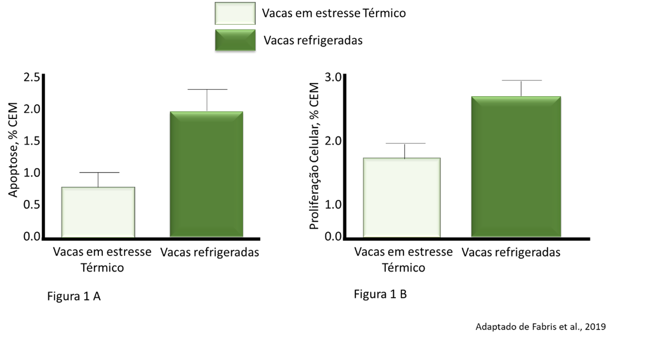 Os pesquisadores observaram que o estresse térmico, tanto no início do período seco quanto durante todo a fase de secagem, diminui a expressão de genes reguladores da apoptose (Figura 1 A) e da autofagia, prolongando a fase de involução da glândula mamária. Como consequência, há um atraso na proliferação de novas células mamárias (CEM)(Figura 1B), comprometendo a produção de leite na lactação seguinte.