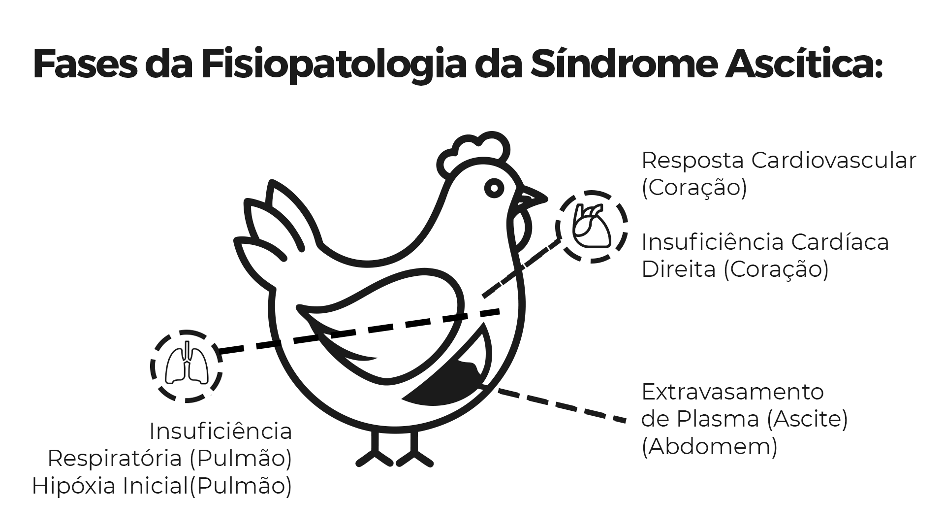 A síndrome ascítica tem como base a hipertensão pulmonar progressiva, desencadeada principalmente pela hipóxia tecidual crônica. Esse processo fisiopatológico aumenta a resistência vascular pulmonar e à hipertrofia do ventrículo direito, culminando em insuficiência cardíaca com consequente a cúmulo de fluido na cavidade abdominal e apresenta custo fisiológico elevado (JULIAN, 2000; WIDEMAN, 2016).
