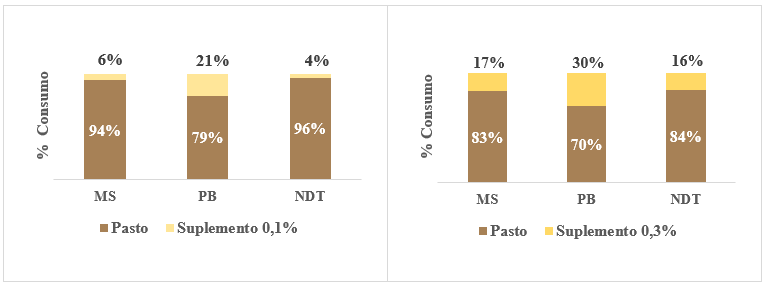 Níveis de proteína bruta ao redor de 12 e 14% significam mais substrato para os microrganismos ruminais se multiplicarem no rúmen. Com mais bactérias no rúmen, a fibra com potencial para ser digerida é degradada com mais velocidade. Isso acelera a taxa de passagem do alimento, liberando espaço no rúmen, estimulando o consumo do animal. Ou seja, o animal come mais, e com isso, mais energia oriunda do pasto passa a ser aproveitada tanto pelas bactérias quanto pelo próprio animal, o que reflete em melhor desempenho produtivo.