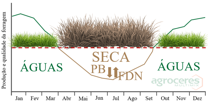 A forragem precisa de luz, temperatura e umidade adequadas para crescer. No Brasil existem 4 estações ao longo do ano (primavera, verão, outono e inverno), que provocam alterações climáticas que influenciam diretamente a produção de forragem. No período seco do ano, em que a chuva cessa, a temperatura cai e os dias ficam mais curtos, as pastagens perdem a qualidade e passam a ser caracterizadas principalmente pelo baixo teor de proteína bruta (PB) e pela elevada lignina na fibra em detergente neutro (FDN) (Figura 2).