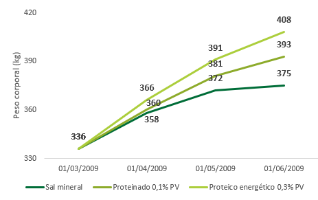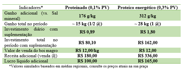 Considerando um período de 90 dias de outono, observe um exemplo comparando sal mineral, proteinado (0,1% do peso vivo) e proteico energético (0,3% do peso vivo):