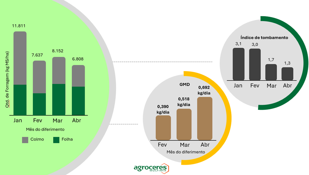 Figura 4. Efeito do mês de diferimento sobre a estrutura da forragem, ganho médio diário (GMD) dos animais e índice de tombamento da pastagem. Fonte: Santos et al., 2009